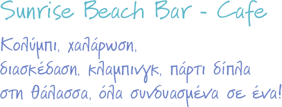 Το Beach bar "Sunrise" λειτουργεί από το πρωϊ μέχρι το βράδυ, κερδίζοντας από την αρχή τον επισκέπτη με τα καλύτερα παγωμένα ποτά και εξωτικά coctails που προσφέρει.