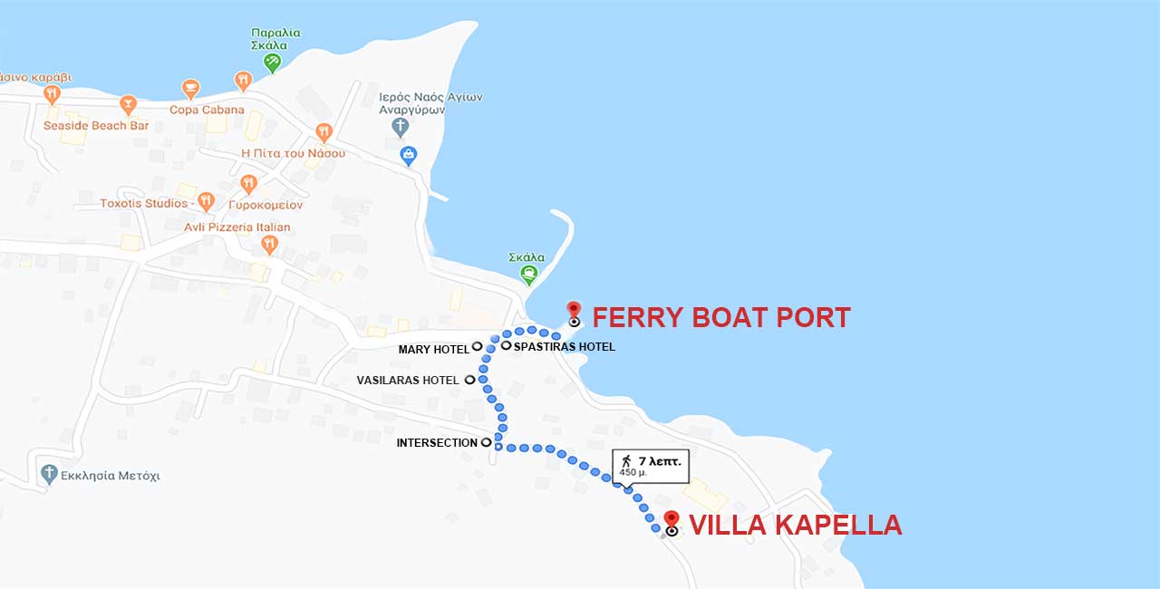 To get to "Villa Kapella", when we get out of the ferry boat, after the small square, we take the road to the left, passing between the "Mary" and "Spastiras" hotels. Following this road, 30 meters after the hotel "Vassilaras" at the junction we turn left, as the dotted line on the map above shows. Continuing this road after a while we reach "Villa Kapella".